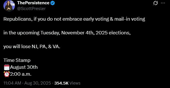 On March 5, 2025, Presler posted that he was focused on the PA race saying “Right now, I am focused on New Jersey & Pennsylvania.” On March 9, 2025, Presler posted regarding the PA election tagging Republican candidate Josh Parsons and saying “Our Republican candidate is @Josh_Parsons. Join me on Monday to knock on doors & on Tuesday to register voters”.
