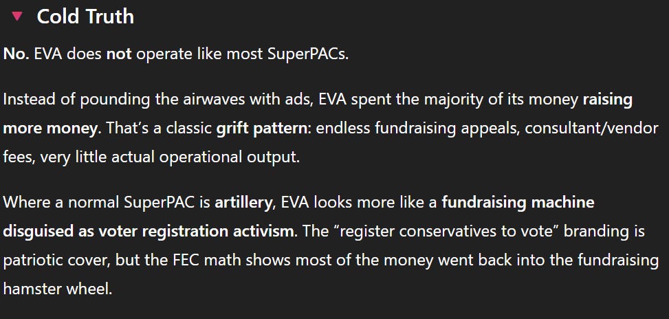 “Information Cataloging Strategies” almost certainly wasn’t delivering $2.8M worth of campaign services. Instead, it looks like a phantom vendor used to launder EVA PAC’s money, parked at Atencio’s Vermont address for cover.